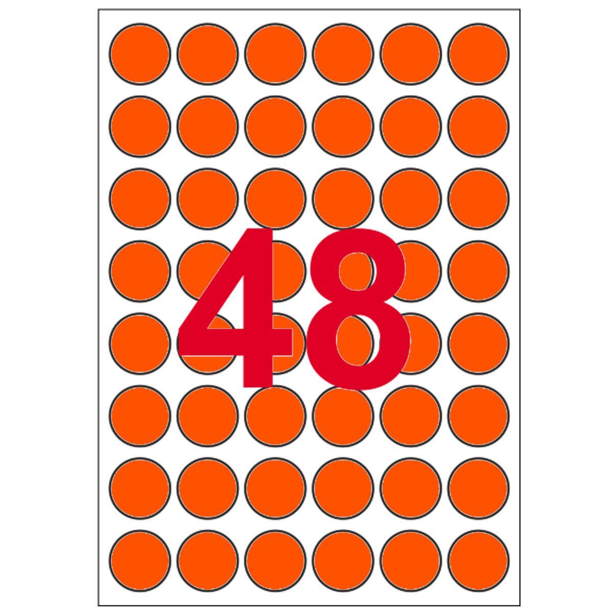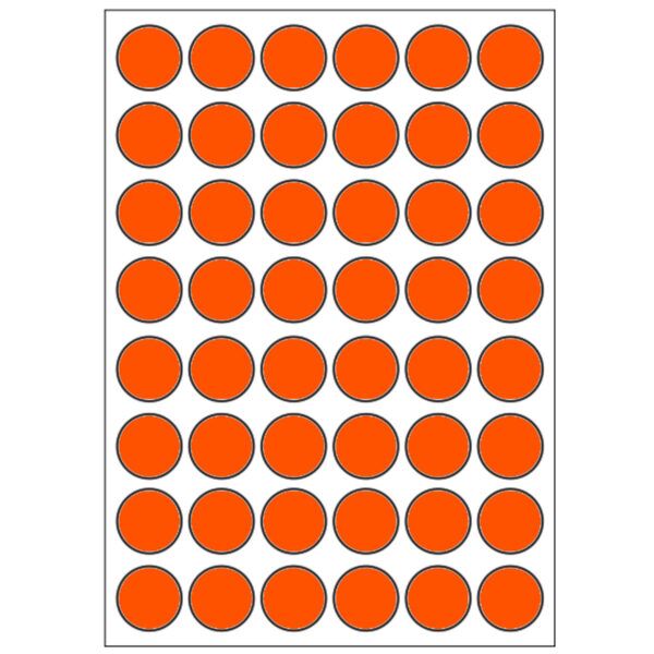 Print etikety A6 kruh 15 mm, reflex. oranžové, 48ks na jednom hárku A6, 10 A6 hárkov v balení značky EMY sú samolepiace etikety na hárkoch formátu A6.